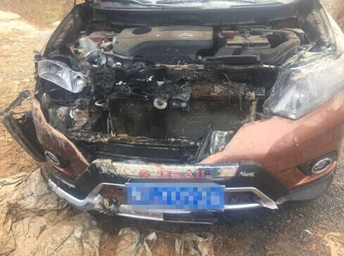 东风日产新奇骏汽车右前部位烧毁严重(欧先生供图)