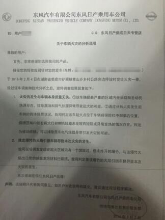 东风日产公司出具的火灾情况分析报告(欧先生供图)