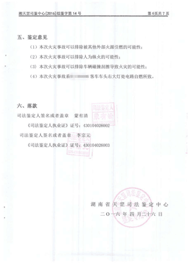 湖南天罡司法鉴定中心出具的起火原因的鉴定书(欧先生供图)