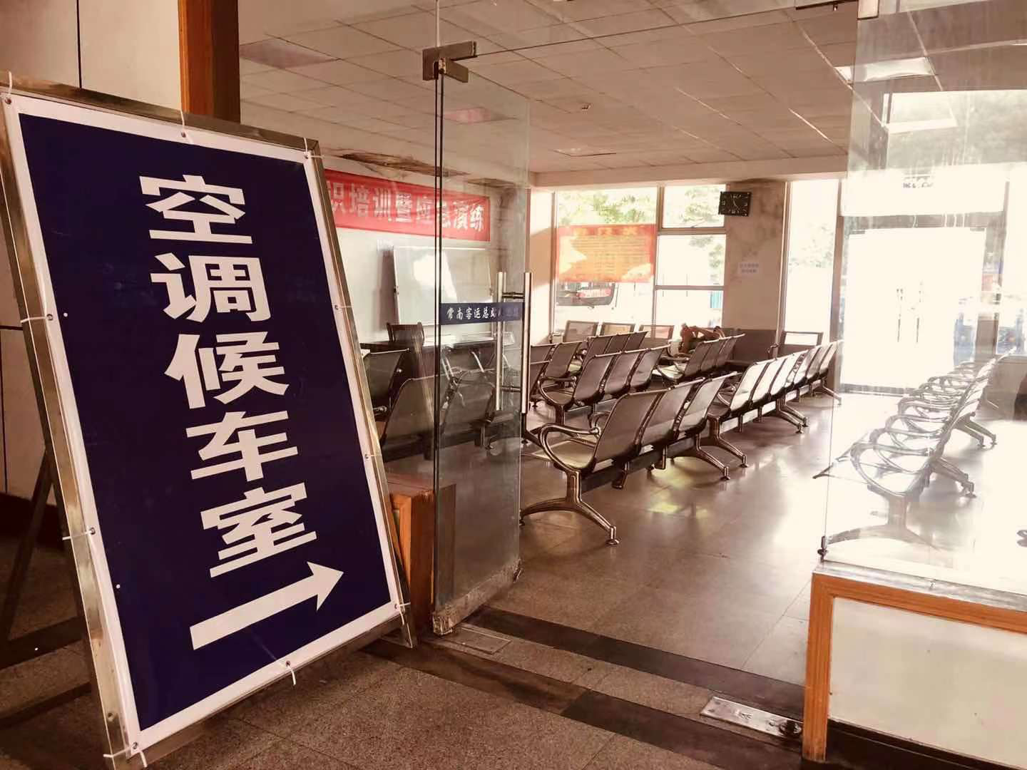 3、进入高温天气,常南汽车总站在候车大厅的左侧设有空调候车室(为保持自然通风此处的门已拆),开启空调向旅客开放。由于面积比大厅小,空调效果比较好(附空调候车室图)。