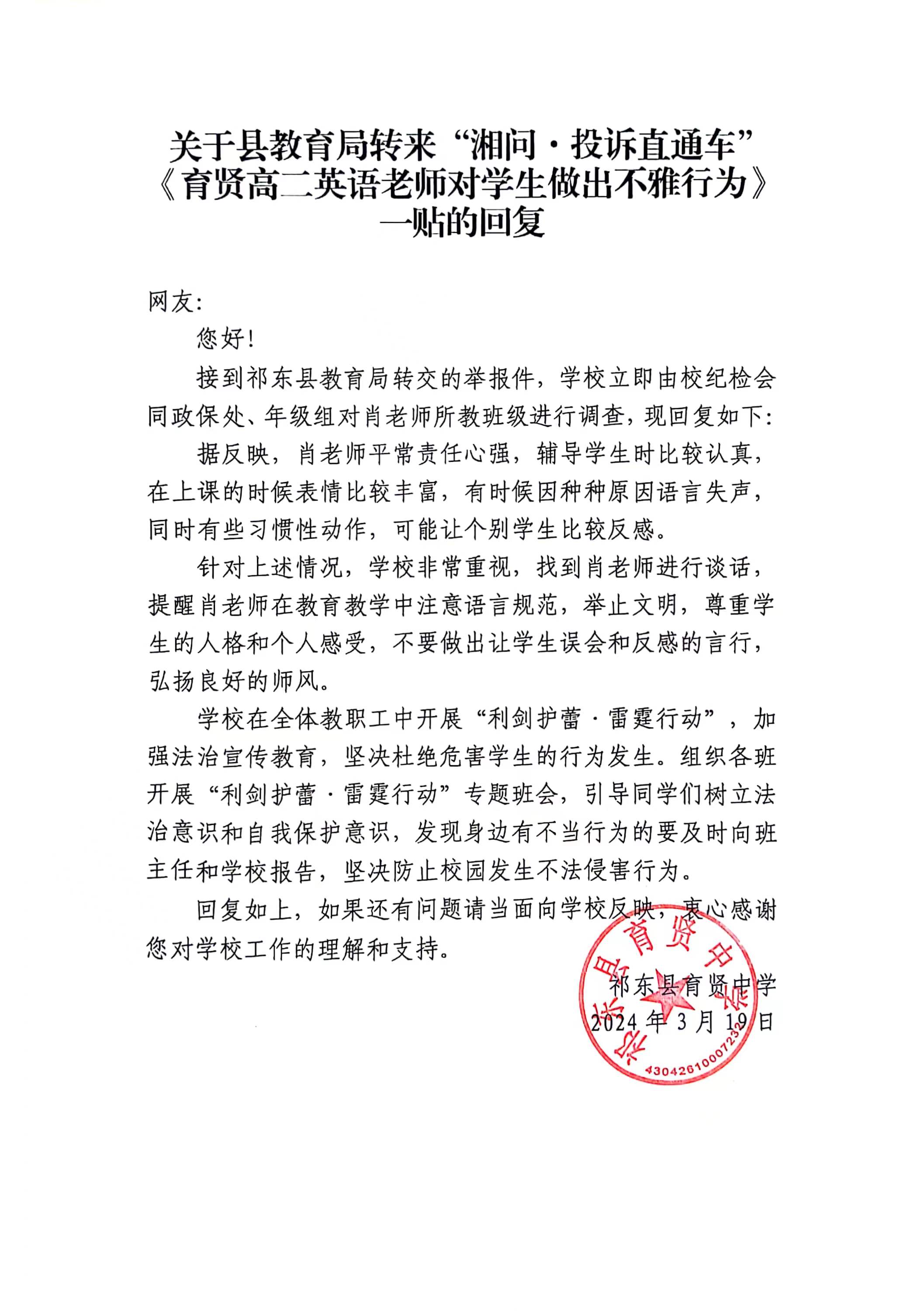 祁东育贤肖*斌老师,在授课期间,曾多次对学生吐舌头并且嘟嘴巴,借助查英语作业课课练多次捏学生的耳朵(他说这是惩罚),在元旦晚会期间,班上女生排完节目围成一圈讨论节目时,他凑过去站在中间并与学生靠的很近,听以前他授作为一位老师,同时也是一位中年人,难道还不知道男女有别嘛,更何况是十几岁的学生,他未婚,已经40岁左右,很难不让人怀疑他这些行为是为了什么,班上人和其他老师吐槽他的部分行为后,他知晓后,在班上对学生进行教育,说不许和其他老师乱说,可这些行为是他确确实实有的,他的授课方法也很难让人觉得他是一位高中教师,上课时,不知道为什么要夹着声音讲话,偶尔还冒出来气泡音,也有借着自己老师的身份在不占理的情况下对学生进行教育