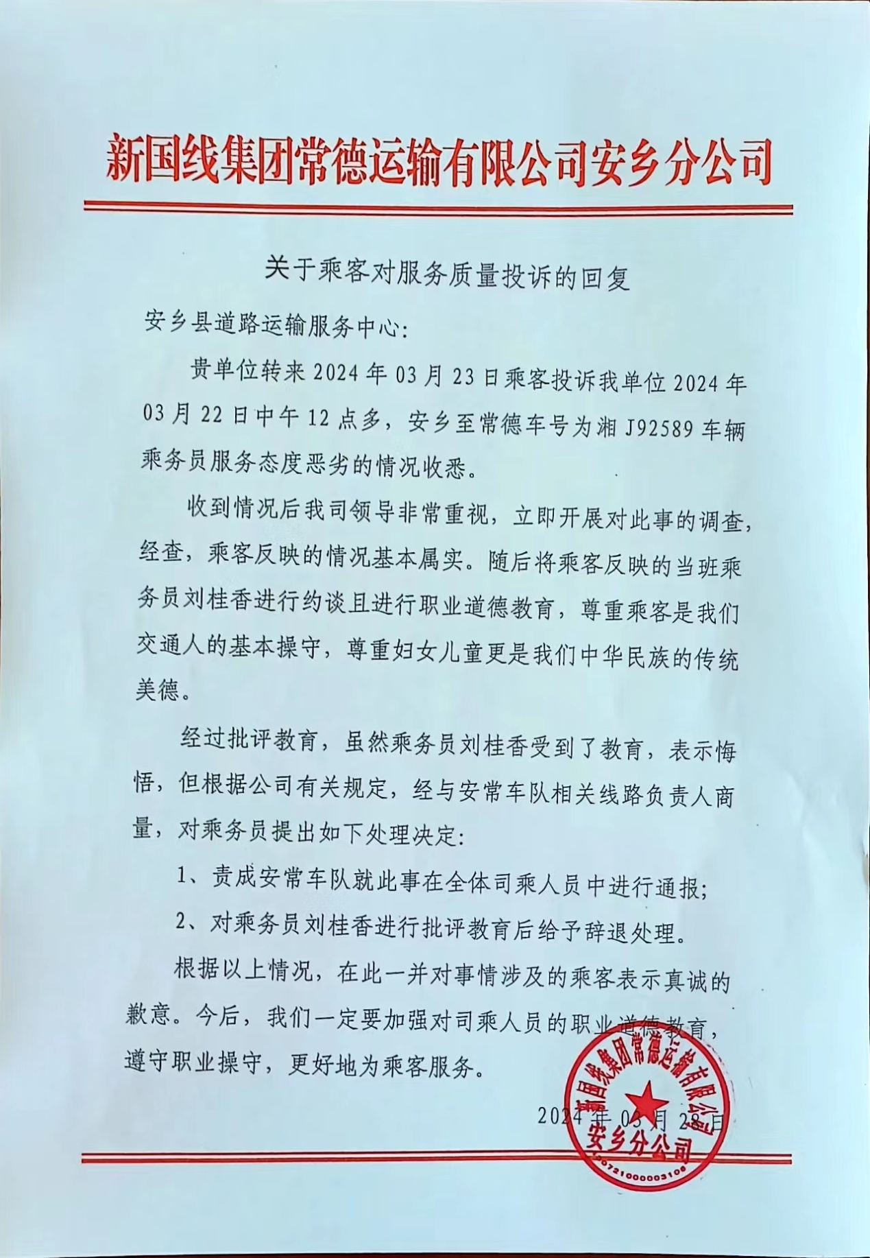 收到反映的情况后我局非常重视,立即开展调查,经查,乘客反映的情况属实。已责成新国线安乡分公司根据公司有关规定,对驾驶员、乘务员作出如下处理: