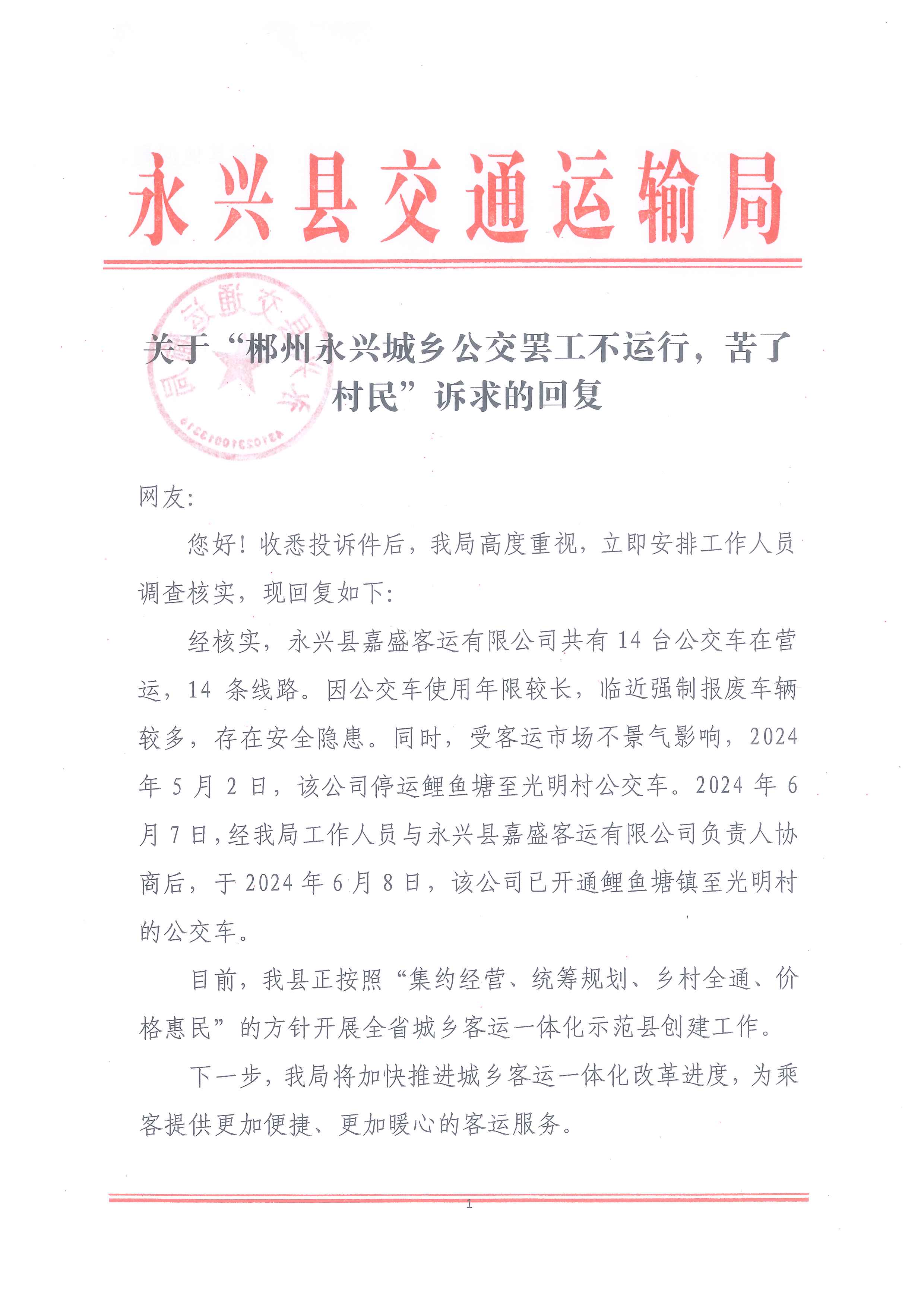 从2024年5月份开始,每逢赶集日从 鲤鱼塘镇—- 光明村 的往返公交车就停止运行了,给我们村民造成了很大的不便。据说司机觉得人少所以就不来了,但我们这村每次最少也有10人次以上,还不算路过其他村的人次。村里都是些留守老人和小孩,购买日用品,去镇上看病等都非常不便,且现正是购买农作物肥料,农药品季节。由于连赶集日仅有的一趟公交车都不运行。导致我们村民叫苦连天。无法出门购买日需品。