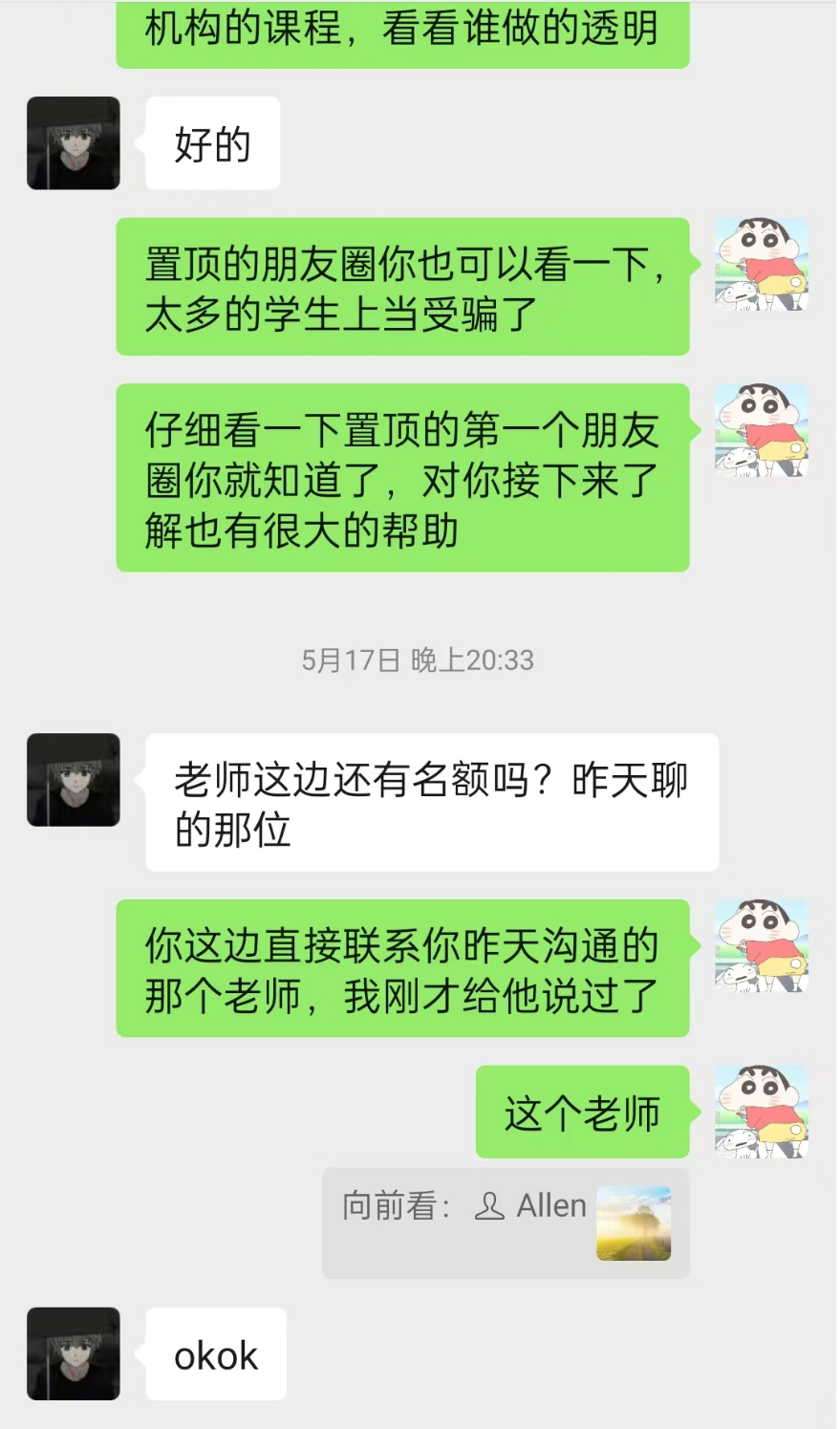 2024年5月16日夜晚听完公开课,自己主动表示对小班的课程感兴趣,随后助教都是正常在介绍我们的服务和课程,当天晚上约到了我们老师的沟通,在5月17日上午助教正常回访这名学生,该学生表示还在考虑中,还在对比其他机构,然后再5月17日晚上8点半主动找过来问还有名额不,随后交钱加入的小班。整个报名之前,该同学是通过对比,了解清楚以后,主动加入的小班,助教只是在正常的介绍课程,关于价格该同学不止一次表示价格贵,但是我们价格做的透明不存在价格战都是一视同仁的,当时嫌价格贵完全可以不加入小班,何来的诱导呢?