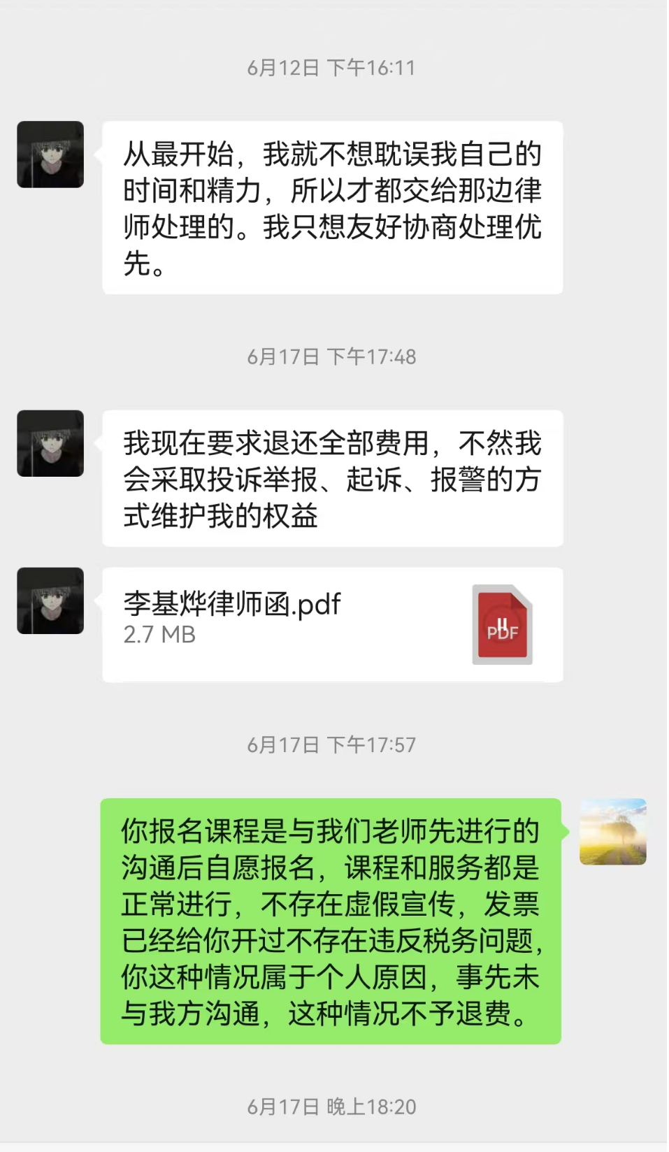 直到6月11日突然从助教要联系方式,谎称有学生要报名小班,其实是自己找的律师打的电话,很莫名奇妙的就把律师函发来了并且对我们进行恐吓,说到退全部的费用,不然就要投诉举报,起诉,报警,等等。(具体详情见下面截图)。除此以外,该同学还通过市场热线,市场监管部门进行投诉,市场监管政府部分也介入了解了详情,并不存在该同学在晚上抹黑我们的事实,表示有意义可以直接进行起诉。