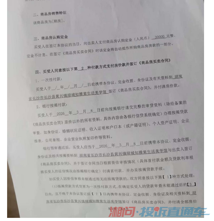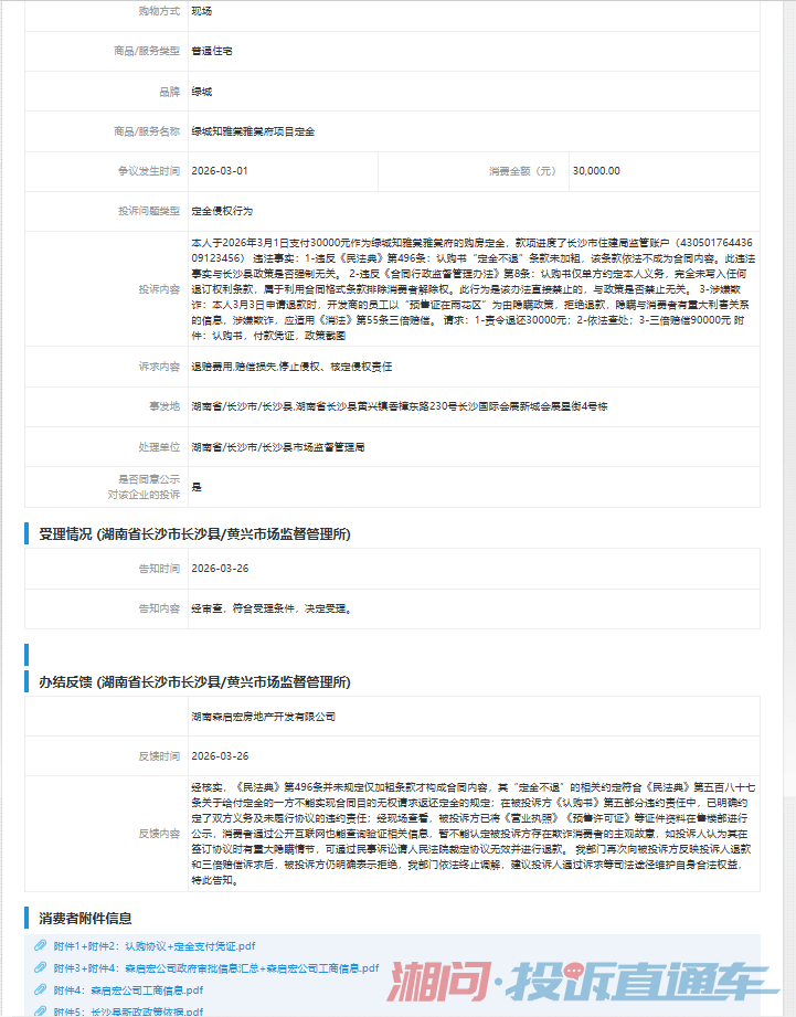被投诉单位:湖南森启宏房地产开发有限公司(统一社会信用代码:91430121MAEM6JN89Y,地址:长沙县黄兴镇香樟东路230号)事发时间:2026年3月1日事发地点:长沙县黄兴镇清水塘路与杜家坪路交汇处东南角(绿城知雅棠雅棠府项目)事实经过:本人于2026年3月1日与被投诉人签订《商品房认购书》,并支付购房款30000元(附付款凭证)。认购书仅单方约定“乙方未按时付款的,定金不予退还”,但未约定被投诉人违约(如无法按期签约、无法办理贷款等)时应当承担的对应责任。法律依据:根据《合同行政监督管理办法》第八条,经营者不得利用格式条款...