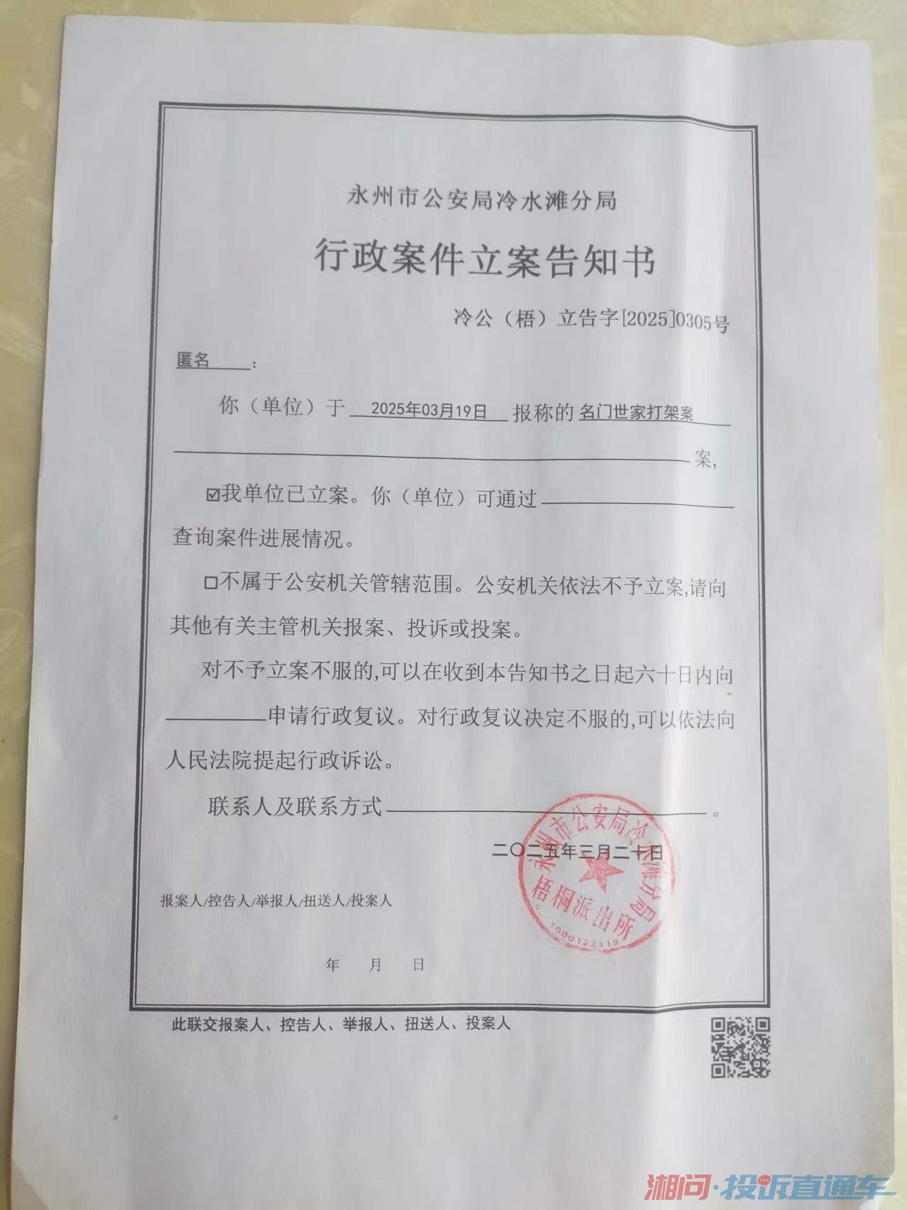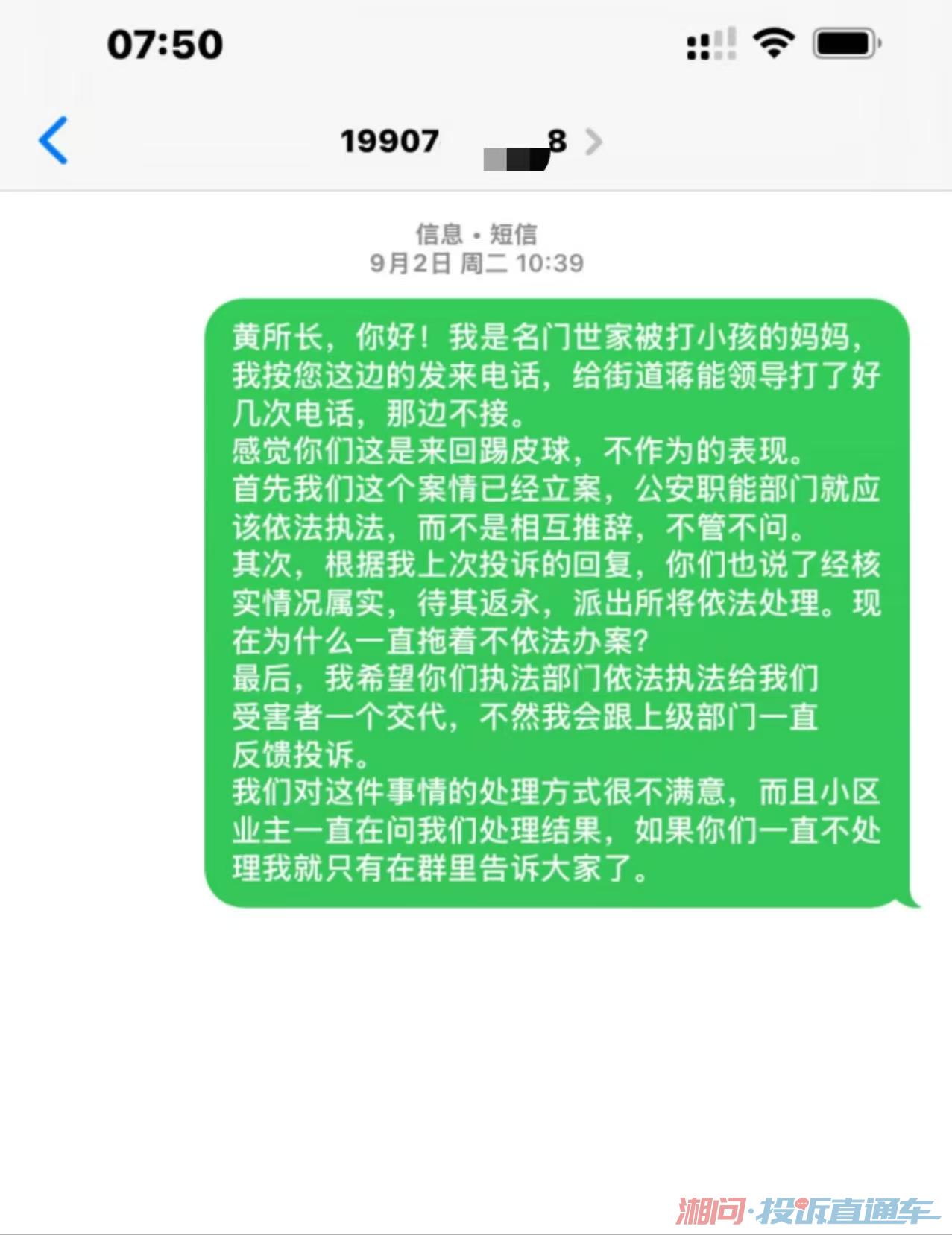 未成年人被成年人殴打致轻微伤,派出所至今不处理,未成年人的合法权益谁来管?尊敬的上级领导:您好!我是永州市冷水滩区名门世家小区的业主,是未成年人周雯烜的母亲。周雯烜被名门世家南面安置房小区的成年人打成轻微伤,从立案至今未处理,严重侵犯了未成年的合法权益。由于永州市冷水滩区梧桐派出所副所长黄亚斌不依法依规办案、不履行职责、嫌疑存在故意压案不处理,从3月20日立案至今已快有5个月,对于受害者要求依法依规办案的诉求置之不理。垦求上级部门介入核实调查处理,黄所长是否存在违纪违法的行为?望严查!具体情况如下:2025年3月12日,我们小区物业为...