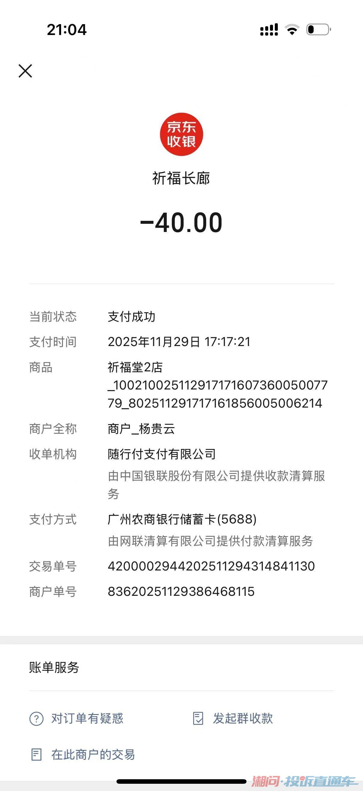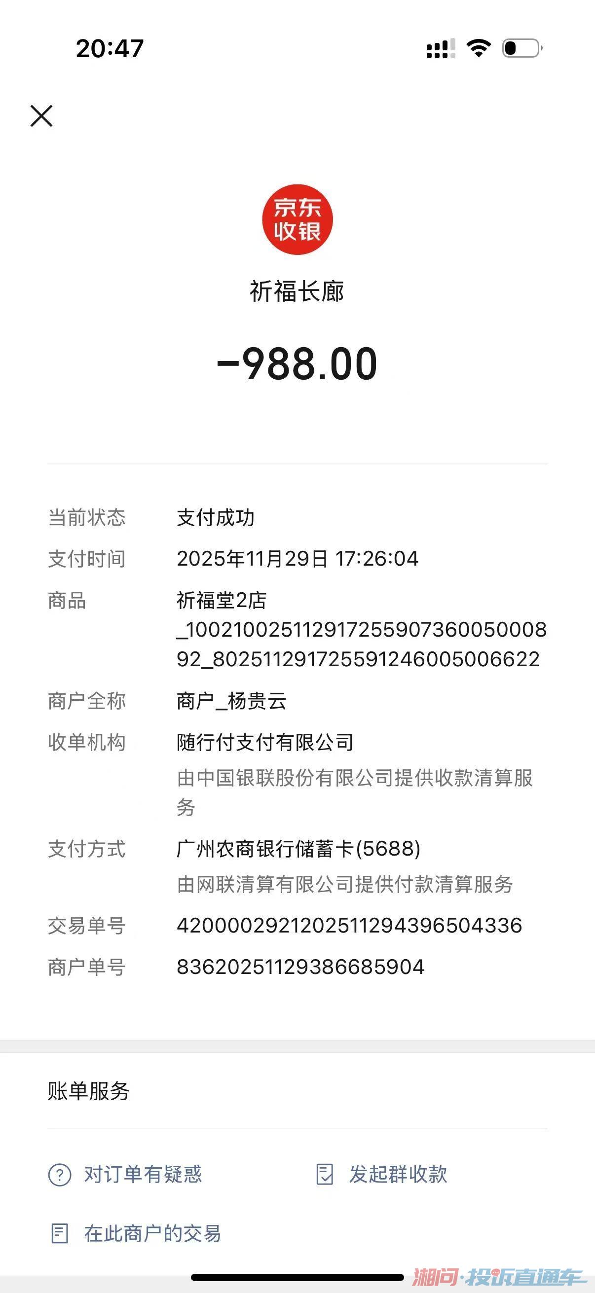本人11月29号下午5点20进去芙蓉景区.然后经过一处祈福长廊祈福牌是10块钱一个,一共买了4个,期间带我们进去里面说写名字,交谈,中间没任何告知需要收费,写完牌子之后,一叔叔把我夫人支开,然后强制要求本人支付988元,说是祈福钱。