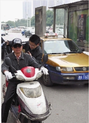 10月25日早上,长沙市松桂园附近,一些赶时间的市民在拦不到的士的情况下只能改乘黑的和摩的。实习生 唐俊 摄