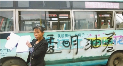 10月25日,益阳桃江县桃花江公共汽车公司,车主胡木英站在已经停开的3路公交车前,展示自己的赔偿诉求。记者 龚磊 摄 ■记者 赵伟