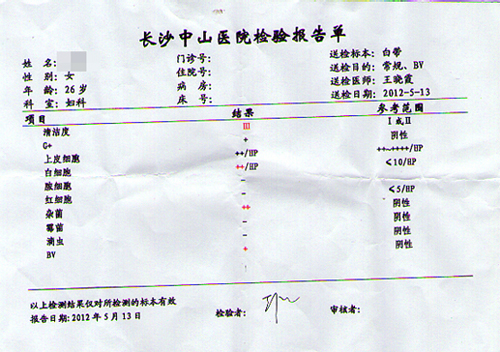 5月13日,钟女士在中山医院治疗多次后的白带常规检验报告单。(网友供图)