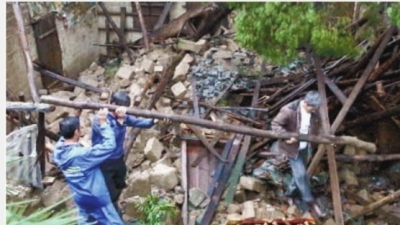 新化县曹家镇周家村周重怀家房屋遭大风冰雹袭击倒塌。5月8日,干部群众帮助自救。郭国权 摄