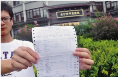 ▲8月20日,长沙市中医医院,王平的朋友向记者展示医院的收费单据。(打黑圈的部分为多收费)