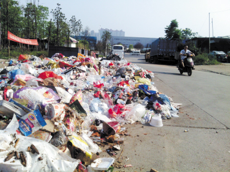 小区出入的马路上,垃圾占去了路面的一半,在烈日下,散发出阵阵臭气。 聂映荣 摄