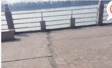 记者看到,发现裂缝的是靠江边一侧的平台广场,该广场约有2个篮球场大小。平台离江面约5米高,台体为石块加混凝土砌成。平台地面铺着红色地砖,在平台上约有30多条长短、宽度不一的裂缝布满整个平台表面,裂缝大都带有修补痕迹。