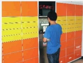 在湖南师范大学后勤服务中心的大厅左侧,有一排高约2米、宽约5米的橘黄色铁皮柜。它由一个主机和两个副柜组成,主机包括操作触摸屏、广告显示屏和条码扫描区;副柜包括3种尺寸的共54个独立包裹箱。