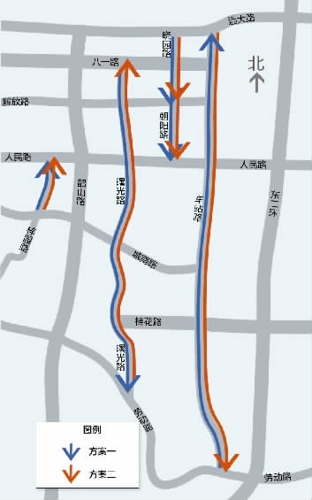 本报10月20日讯 长沙车站路周边交通高峰期拥堵严重,主干道平均车速仅为10-15公里每小时。交警部门针对八一路、远大路、东二环、劳动路、韶山路围合区域拟定两套优化方案,想通过单行管制破堵。曙光路、车站路、梓园路单行线怎么走更好?交警部门今日公布了方案路线,请广大市民提意见。