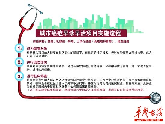 湖南省2013-2014年城市癌症早诊早治项目今日启动,该项目计划完成危险因素问卷调查和高危人群评估5万人,癌症筛查1万人(高危人群)。