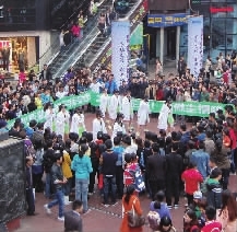 下午4时许,突然出现10名身着白大褂的年轻女孩,她们头戴防毒面具,伴随音乐舞动身躯。在她们身旁,横幅渐展:“关注空气质量,维护你我健康”、“不做吸尘器!不做尘惯吸!”