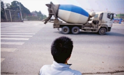 11月6日中午,长沙市芙蓉北路鹅羊山段,龙强站在事发路段马路边,一辆水泥罐车无视红灯,从血迹上呼啸而过。记者 李丹 摄