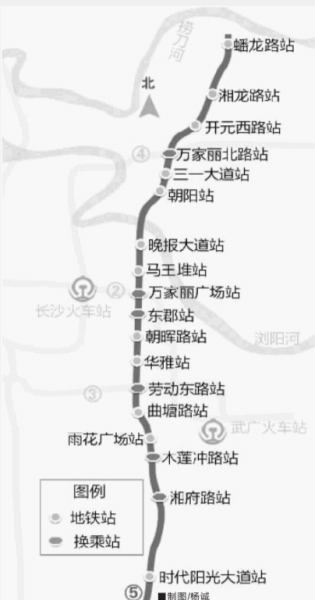 长沙地铁5号线为南北向骨干线路,北起星马安沙镇,主要途经万家丽路、环保大道,接入暮云组团,全长35.7公里,有车站26座。