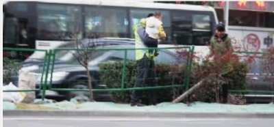 11月27日,长沙市德雅路,市民抱着小孩从道路中间的围栏缝隙中过马路,而附近就有新建的地下通道。实习生 何佳乐 摄