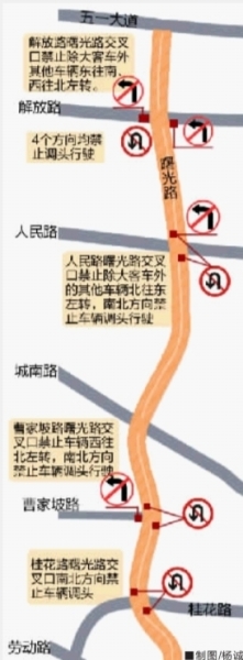 拟定实行的优化方案中,解放路曙光路交叉口禁止除大客车外其他车辆东往南、西往北左转,4个方向均禁止调头行驶;人民路曙光路交叉口禁止除大客车外的其他车辆北往东左转,南北方向禁止车辆调头行驶;曹家坡路曙光路交叉口禁止车辆西往北左转,南北方向禁止车辆调头行驶;桂花路曙光路交叉口南北方向禁止车辆调头。
