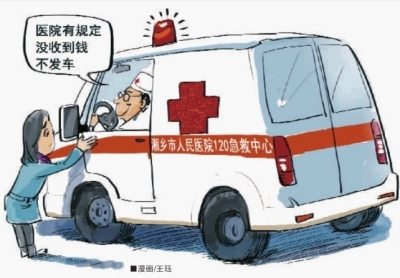 在湘乡市人民医院120急救中心的墙壁上,挂着 “时间就是生命”等字样。事发后,面对质疑,工作人员仍一再表示,先交钱再发车,是该院急救中心的规定,即使对危重病人也一样。
