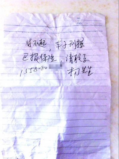 1月12日中午时分,她驾车出门,刚开了20米,突然发现雨刮器上卡了一张纸条,黄丽赶紧停车查看。皱巴巴的纸条上面,几行字清晰可见:对不起,车子刮擦,已报保险,请联系155********,杨先生。