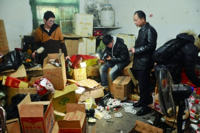 1月13日,长沙市芙蓉区东岸街道一制造假酒窝点,执法人员在清点各种名酒空瓶。 实习记者 唐俊 摄