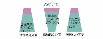 2015年起,中考学科分值调整,语文分值由原来的120分增加到150分,英语总分不变,增加英语口语考试20分,体育由原来的50分增加到60分。