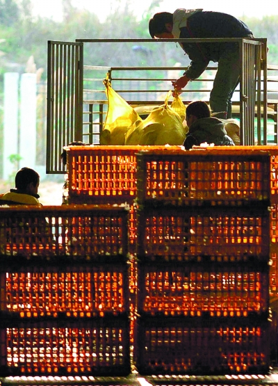 1月21日,福州海峡家禽批发市场经营户将已经消毒的活鸭装车。近日,广东、浙江等地禽流感的发生再次让人“谈鸡色变”,加之冬季又是禽流感的易发季节,一些消费者还是有所担心。新华社 图