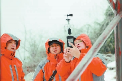 2月10日上午,国网常德供电公司冰情特巡人员在输电线路下测试风向及风力大小。彭浩 摄