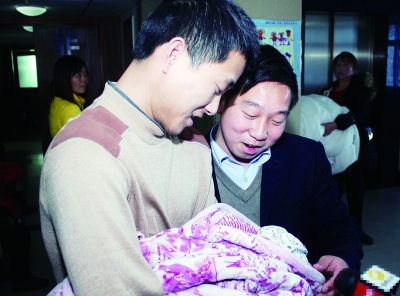 2月19日,长沙县妇幼保健院,的哥徐景林(右)去医院看宝宝时,露出开心的笑容。 实习生 何佳乐 摄