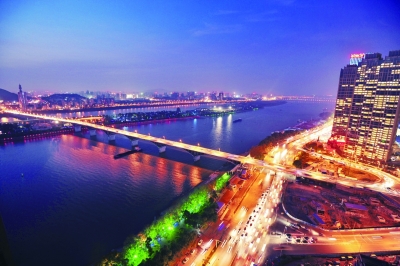 从上个世纪七十年代建成至今,橘子洲大桥仍是长沙过江主要通道。图为橘子洲大桥夜景。记者 童迪 摄