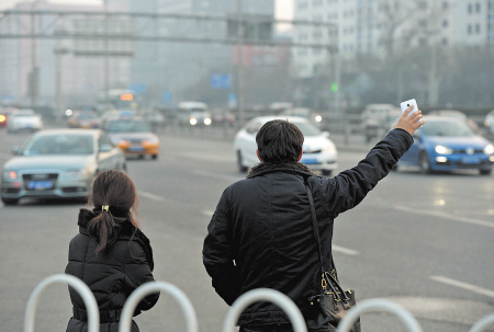 昨日下午5时多,北京市西四环中路,两个市民通过手机上的“嘀嘀打车”软件,仅用了不到3分钟即打到了的士。 特派记者 石祯专 摄