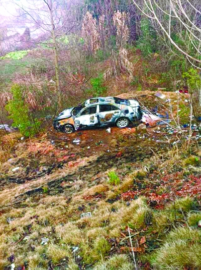 ▲凯美瑞小车冲下公路,起火烧得面目全非。记者 陈昂 摄