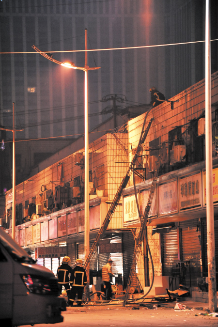 昨晚10时20分,当记者赶到事发地点时,十余辆消防车和众多的消防队员正在扑救大火,当地派出所和巡警对周边进行封锁,交警部门也出动警力在周边进出通道进行交通管制。失火门面位于粮油区A栋的后面,因通道狭窄,消防车无法进入。记者看到,消防队员在15号门面位置架起长梯,登上楼顶后手持水枪扑火。一名姓李的目击者说,当时发生了五六次爆炸,最后一次,“一个直径半米的火球,飞到了几十米外的对面楼顶,估计是个小型的气罐。”