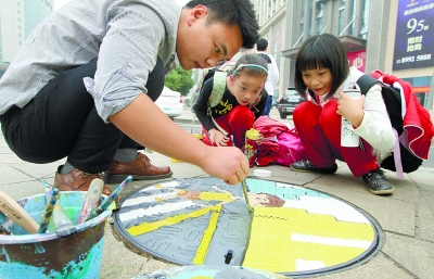 2013年10月28日,长沙县开元路与天华路路口,工作人员在为下水道井盖绘制卡通形象。