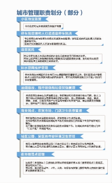 需要在市级申报的审批,主要是大型广告户外设置;城市生活垃圾经营性清扫、收集、运输、处理服务和建筑垃圾处置。这意味着,今后各区政府将全面负责组织实施辖区内城市管理维护和综合行政执法工作。
