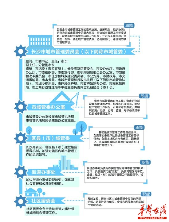 2014年4月1日,长沙召开城市管理工作会议透露,按照十八届三中全会精神和省委、省政府的要求,长沙市实施城市管理体制的重大改革:成立长沙市城市管理委员会,由市委书记任顾问,市长任主任,19个部门为成员单位;实行责权利重心下移,由各区政府(含高新区)全面负责组织实施辖区内城市管理维护和综合行政执法工作。
