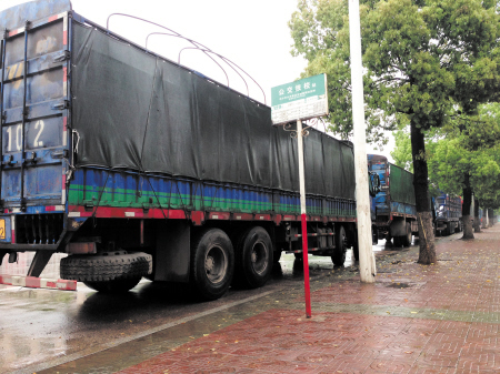 大货车把公交技校公交车站霸占得寸土不留。“乘客看不到站牌,公交车没法进站,只好在马路中间上下客。”几名候车的市民只好站在距离公交站20米远的路口,看到公交车来了,就招手示意。
