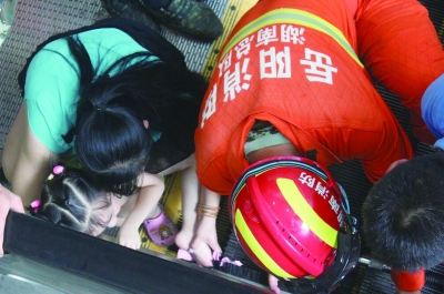 8月1日中午,4岁的丹丹穿着洞洞鞋在乘坐超市手扶电梯时,左脚被电梯卷了进去,消防人员在现场进行紧急救援。通讯员 周广 摄