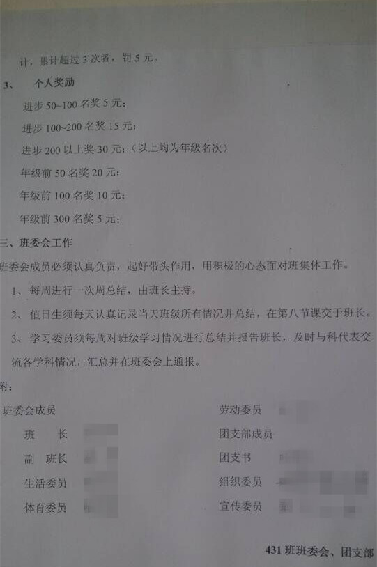 平江一中431班的“最严班规”(刘同学供图)