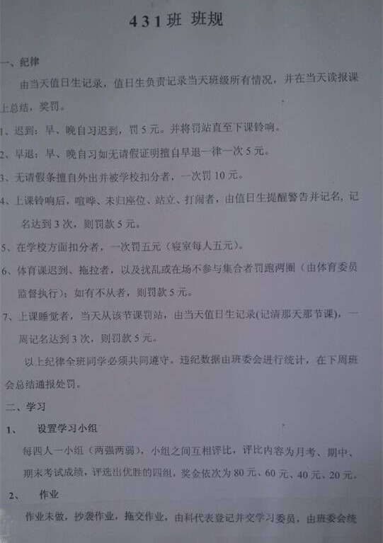 刘同学告诉记者,新班规是9月初由班干部制定并实行的,目前班上有十多人受到了罚款的处罚,罚款金额从5元到几十元不等,部分寄宿生怨声载道,抱怨班规的严苛与不公,寝室因个别同学的原因被学校扣分后,一个寝室的人都要被罚款。