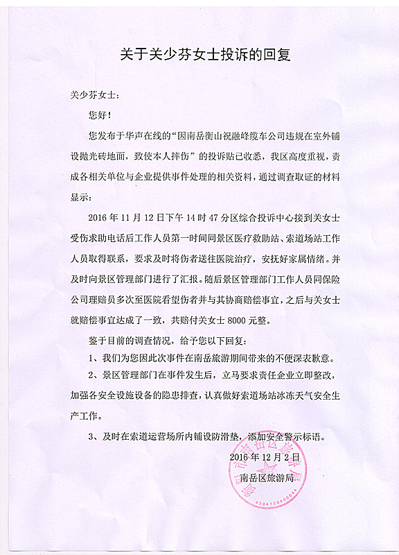 我在本月12号去到南岳衡山祝融峰祈福,我在下榄车后在唯一一条几层楼高的过道不幸滑倒摔伤,导致我腰椎两处骨折需救护人员用担架抬走送院,当时还有另外两人滑倒摔伤,导致我们滑倒摔伤的原因是因为榄车公司没有按照国家建筑安全生产规定在室外地面必须使用防滑砖,他们在室外使用抛光砖并镶嵌金属铁片并且地面湿滑致使我们无法站稳摔倒,致使我住院九天不能动,生活无法自理,24小时依靠护工服侍,该景区工作人员只来看过我一次并拒绝赔偿给我。
