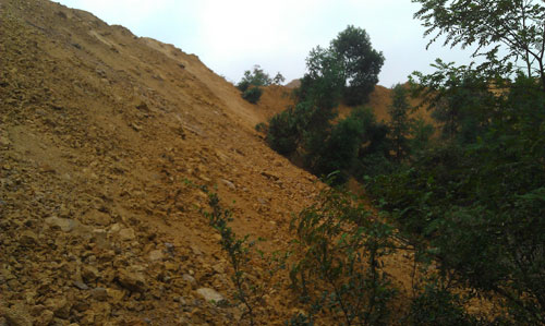 宁先生是集里街道办事处东沙村枫树组人。今年7月的一天,一大早,宁先生突然发现他家的养殖场周围堆起了很高的渣土。“这里本来是条山路,旁边还有些长了好几年的杉树,现在却被渣土堆满了。”11月10日,顺着宁先生手指的方向,记者看到,他家养殖场后面那堆渣土都有好几个足球场大小。