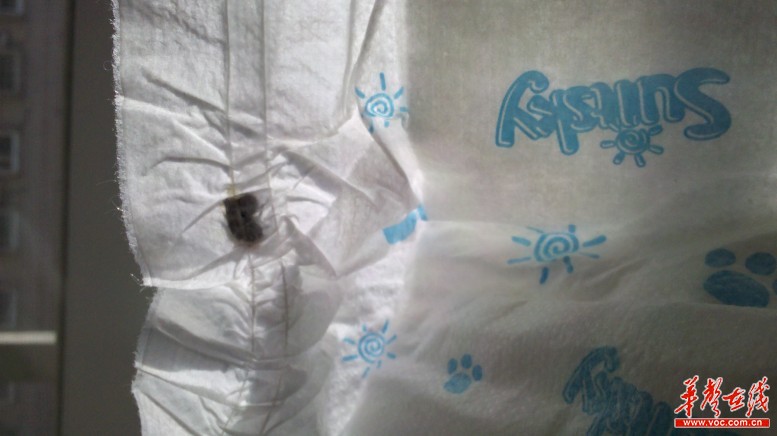 “10月13日,我出差回来,老婆告诉我,宝宝的尿不湿里有个大头苍蝇”,李先生告诉记者,“我开始还不大相信,但看到老婆拿在手里的尿不湿,边缝上一个图钉大小的苍蝇被缝进去了,这绝不可能是我们没保存好、苍蝇自己飞进去的吧!”