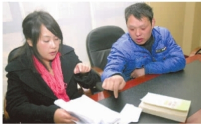 12月13日,湖南金州律师事务所,民工宋志军(右)向律师反映拖欠工资问题。记者 武席同 摄
