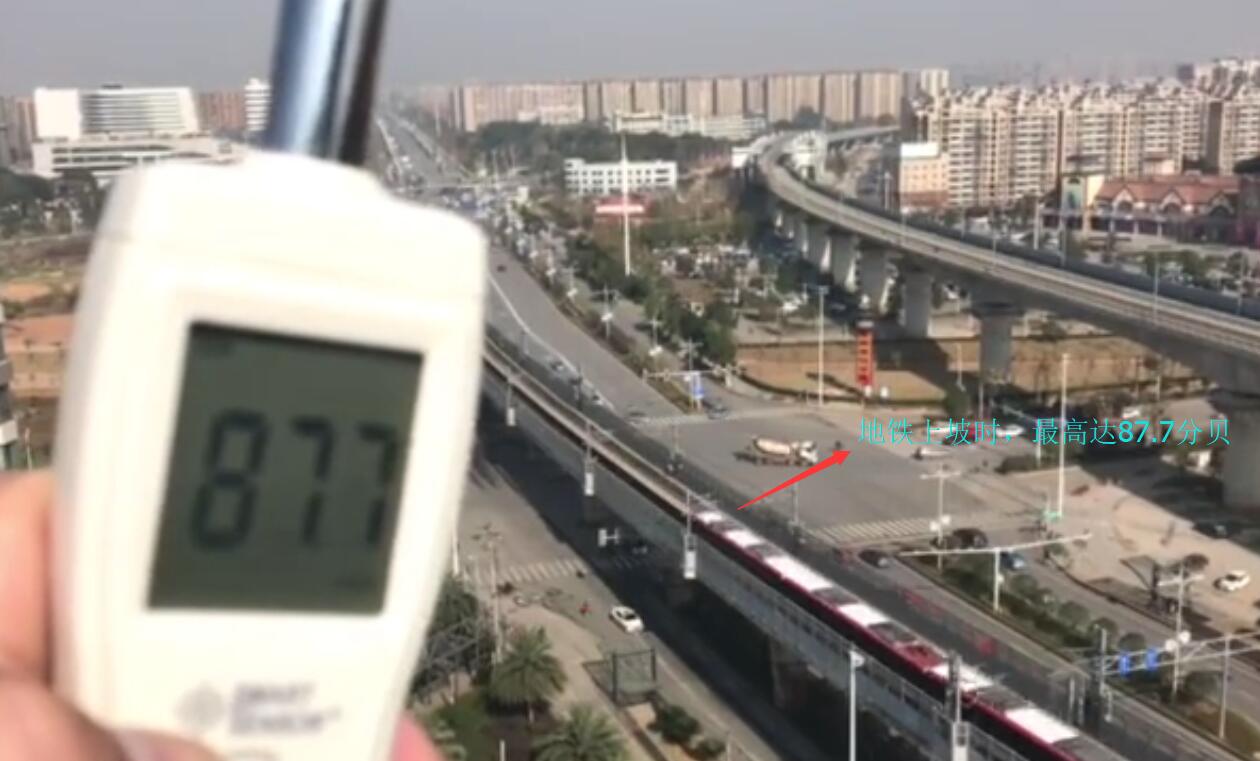 ( 业主在地铁1号线尚双塘站附近进行地铁通过时的噪音分贝测试。在安装了半封闭的隔音屏的情况下,地铁下坡时,噪音最高达92分贝,地铁上坡时最高达87.7分贝。)